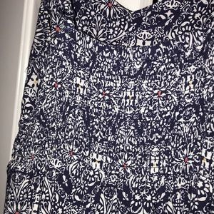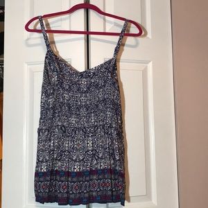 This tank has interesting designs all over it. It has elastic on the top of the back and right under the breast. It has adjustable spaghetti straps,