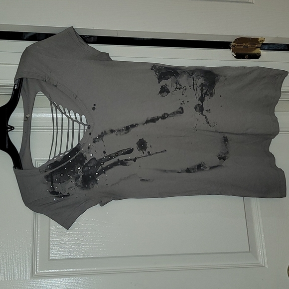 Shirt features a front design and back cut out shirt design as well. Tag was cut off due to being shown when worn.