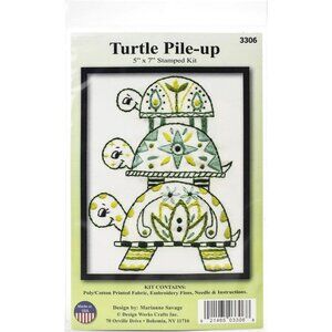 Turtle Pile-Up Stamped Embroidery Kit #3306 Sealed. 5" X 7". This embroidery kit provides a delightful design featuring stacked turtles, complete with instructions, poly/cotton fabric, and embroidery floss.