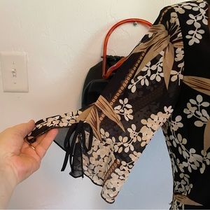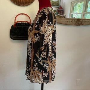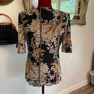 Design Works Top Beautiful Florals! Rhinestone Details Size PL. 5 Rhinestone Buttons down front. Shoulder pads. Rhinestone details on the v-neck. Bow and ruffle on the sleeves. Lined in all the important places. Armpit to armpit measures 20” to 21” stretched. Shoulder to bottom hem measures 27”. Excellent condition!
