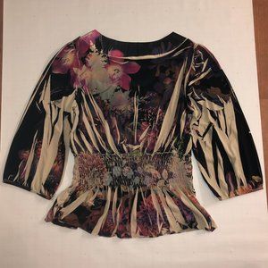 Beautiful and elegant blouse with tie dye design and floral print. Ruching detail that accentuates the waist. Crew neckline and puff sleeves. Size Large. Brand New.