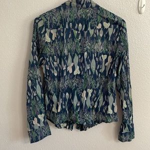 It came from S. Korea so it reflects size 40, but fits a small as a loose shirt. Button up blouse with some ruffles design in front.