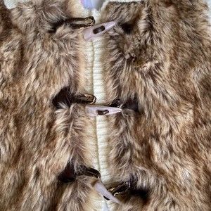 Design by Max Moretti Faux Fur Knit Girl’s Jacket Size 6 Cream. 100% lining, shell - acrylic polyester blend. In excellent condition except some peeling on closure (faux leather), please see last photo.