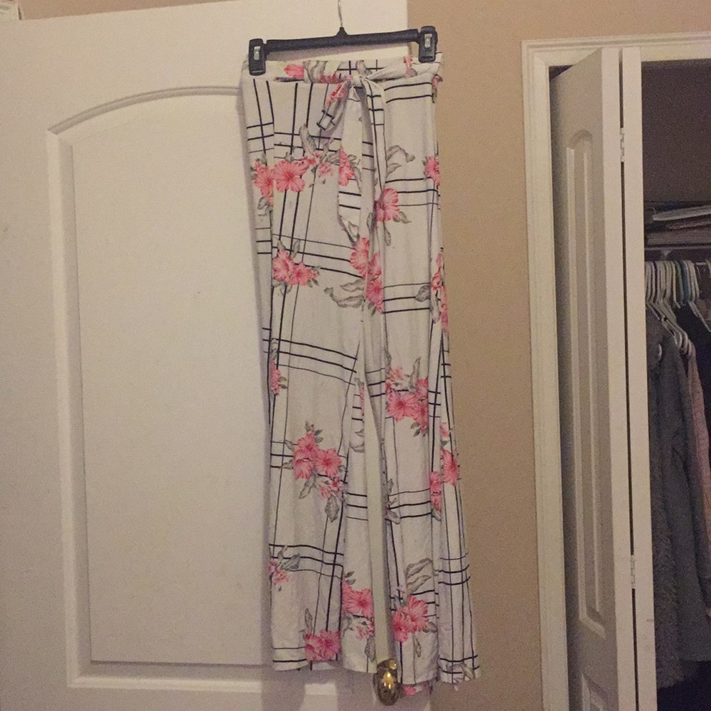 Floral and striped designed flare pants tie into a bow at the waist line