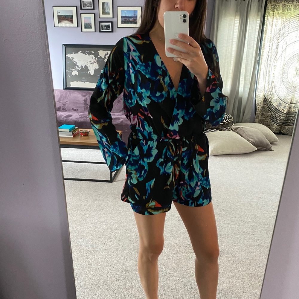 Black & multi-color romper. Long sleeve with pockets. Deep v neck. Size medium. Worn once!