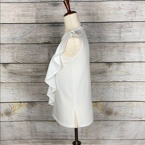 White soft top, 87% polyester, 10% viscose, 3 % elastane. Sleeveless. Side slits. Size XS, armpit to armpit 16 inches, center back length 23 inches. Made in USA. Excellent condition, looks new. B2