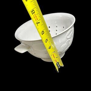DesignPac Strawberry Patch Embossed White Ceramic Colander 8" Round w Handles. Please see photos for additional information and item particulars.