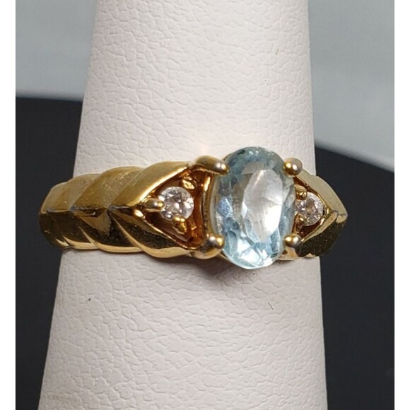 Designed 18k Gold Plated Stainless Steel Light Blue Topaz & CZs Made in Hong Kong Ring Size 5