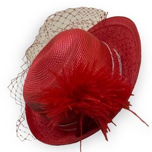 Beautiful vintage red derby hat with a feather accent. This hat also has a mesh fascinator.