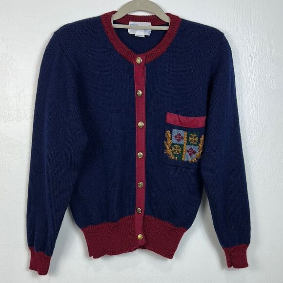 This is a charming vintage wool cardigan featuring a rich navy blue body with deep burgundy trim at the collar, button placket, cuffs, and hem. It has a classic crew neckline and front gold-tone buttons for closure. The standout detail is a front chest pocket adorned with a colorful, folk-style pattern that adds a unique and playful touch. The knit is thick and cozy, making it ideal for cooler weather. A timeless piece with a nostalgic, handcrafted aesthetic