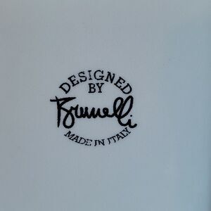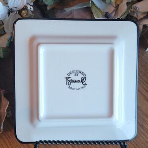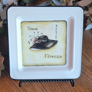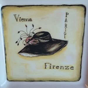 Made in Italy 71/2"x71/2" square designer plate by Brunelli. These plates list cities that are centers of fashion. This one lists Vienna, Parigi, and Firenze. There is crazing but it does not detract from the design. I believe these to be quite rare.