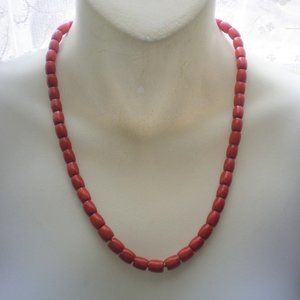 Beautiful Vintage Designer solid 14K Yellow Gold Clasp Color Enhanced Ox Blood Red Sea Coral Barrel Shape Beads Beaded Necklace (marked on clasp "14K GSJ" and acid tested). It is about 21" in length (with clasp). Red Color Enhanced Sea Coral Barrel Shape Beads are about 9mm by 8mm. This unique Necklace weighs about 53 grams and is in great vintage used pre-owned condition.