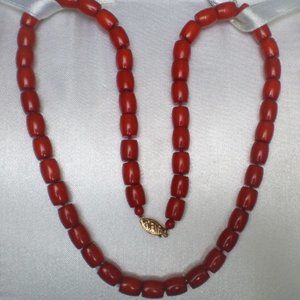 Designer 14K Yellow Gold Clasp Red Sea Coral Barrel Shape Beads Beaded Necklace