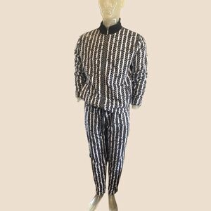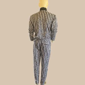 A delightful 2-piece tracksuit with drawstring waistband/3-pocket pants and tapered hemline. The jacket is long-sleeve with a mock neck, zip closure, 2 side pockets and elastic waistband. It is sized medium and fits generously in the right places.