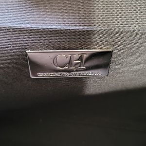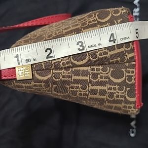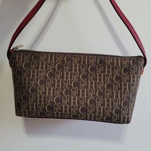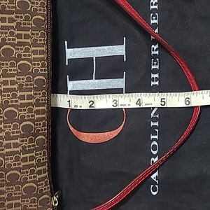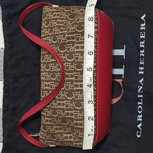 Carolina Herrera shoulder bag with brown logo. Entirely zippered. Red leather shoulder strap and base.