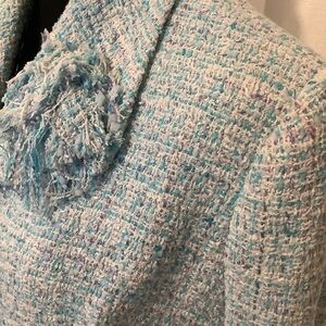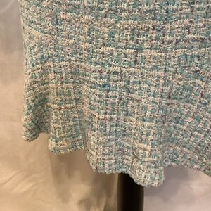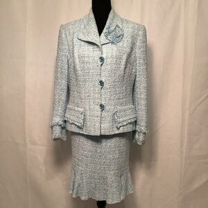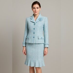 Vintage tweed blend skirt suit by Barbara Bates in size 10. The set includes a skirt with a peplum hem and fringe accent. The skirt is knee-length and features an A-line style. The color is multicolor, with blue as a prominent shade. This formal outfit is perfect for occasions like weddings, parties, or workwear, adding a touch of vintage charm to your wardrobe.