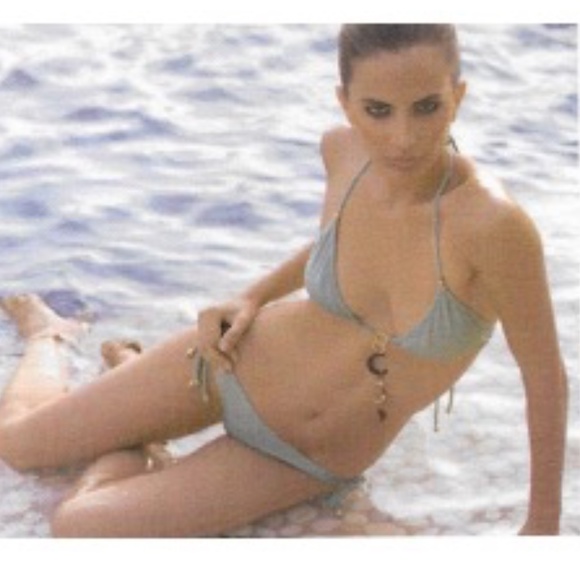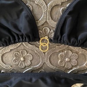 This triangle bikini has all custom balls on the straps but no detachable front charm. The center front has a custom infinity gold ring. Color: Black Size: 3/ M