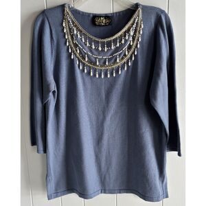 Designer Bob Mackie Wearable Art Size L Blue Beaded Neckline 3/4 Sleeve Top # D