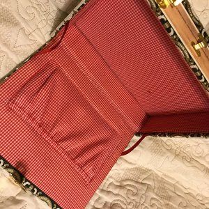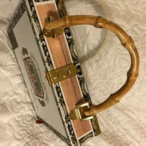 This unique designer cigar box purse gets all the attention. It is a sequined and beaded beach scene embellishes the front with a metal fastener and bamboo handle. On the inside is gingham print lining with two pockets on one side. It has a small blemish on the inside from gentle use. Decorative Italian print is on the backside.