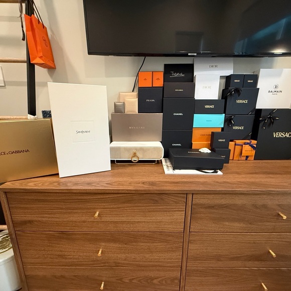 Collection of designer boxes including Versace, Luis Vuitton, Chanel. Hermes, Dolce& Gabbana etc. Perfect for display or storage. DM for specific details