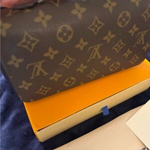Stylish Louis Vuitton pouch with classic monogram pattern. Rich brown tones.