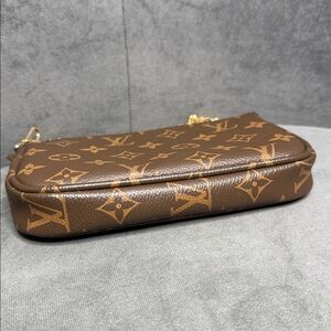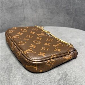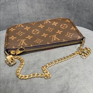 Chic wristlet in iconic brown monogram. Features a luxurious gold chain. Ideal for elevating any ensemble. Like new condition. High quality