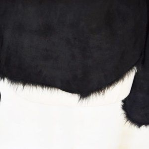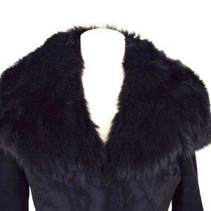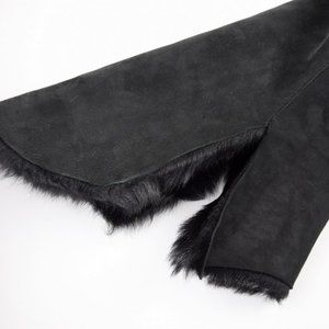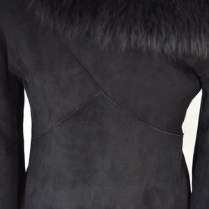This genuine black shearling suede jacket is sumptuous to the touch with the fur used as the lining against the body. The jacket could be described as both edgy, classy and sexy, with a deep luxurious collar to frame the face. It has a beautiful drape to the front and deep slits at the sleeves with asymmetrical edges all around. The coat is labeled to be a size 6 and has one hook at the chest.