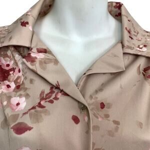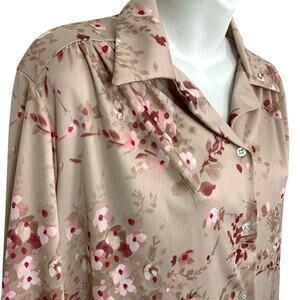 This Designer Collectibles women's vintage floral shirt features a collared neckline, long sleeves with a casual sleeve type, and a button-up closure. Made of lightweight polyester material, this tan shirt has a regular fit in size 14. The top has a vintage style with button accents, making it a versatile option for casual occasions in the fall, winter, and spring seasons.