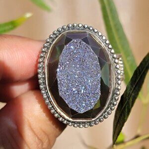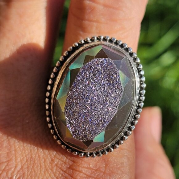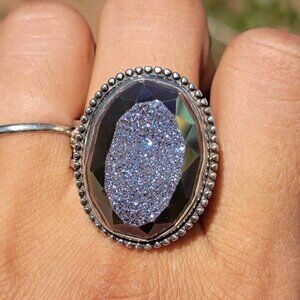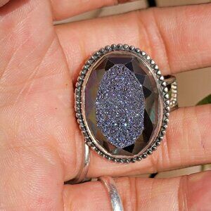 Designer Colleen Lopez purple flashy druzy 925 sterling silver heavy ring adjustable