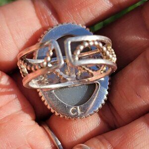Amazing designer Colleen Lopez ring featuring a huge green and blue flashy purple druzy bezel set in solid 925 sterling silver. Exquisite beaded border and whimsical open frame band with beaded swirl pattern. Stamped "CL" and "925" in bold, clear stamps. Adjustable. At current unadjusted size of 11.5. If adjusted smaller will be overlapping. Natural, beautiful patina included. May need a cleaning depending on your preferences. Tested with a neodymium magnet and JSP acid, guaranteed sterling.
