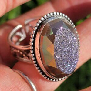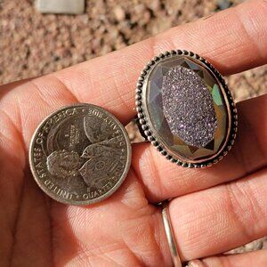 Designer Colleen Lopez purple flashy druzy 925 sterling silver heavy ring adjust
