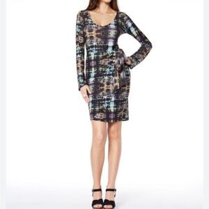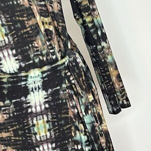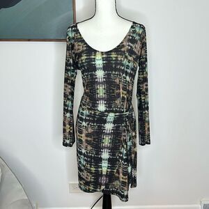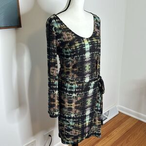 This dress is stunning and soft and comfortable! Faux wrap dress. Tie-dyed pattern in earth, tones of green, pink, black and tan. Excellent condition, only worn once. Size medium. Very stretchy!