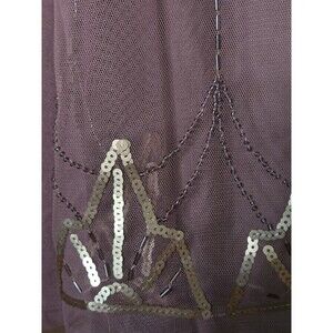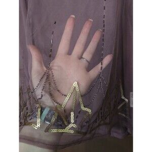 Add some boho chic to your wardrobe with this stunning Designer Decree top. The sleeveless blouse features a sheer purple fabric adorned with shimmering sequins, making it perfect for any special occasion or a night out on the town. The top is available in XL size and is designed for regular size types. The boho style and designer theme make it a must-have for any fashion-forward woman. The top is also accented with a variety of features, including sheer fabric and a unique design, making it stand out from the rest.