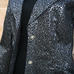 Gorgeous designer jacket! Excellent condition with little to no wear. Very well made and lined. Pewter designs in the jacket are sparkly. Nice rhinestone buttons. Two front pockets.