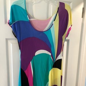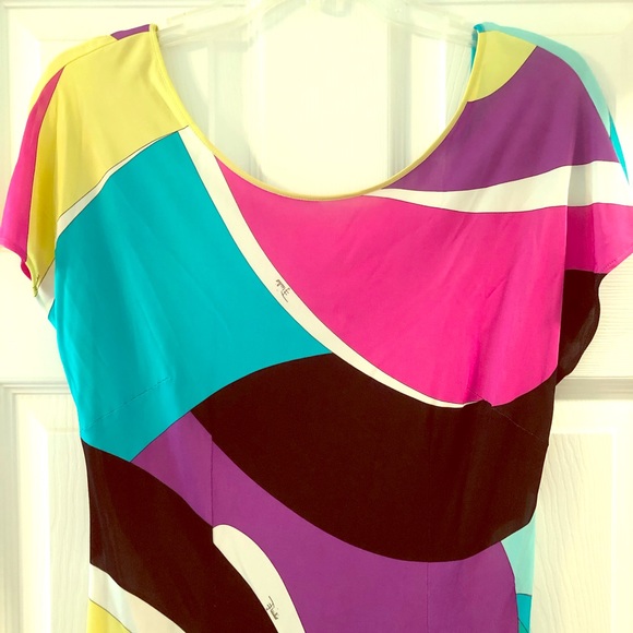 NEVER WORN! Wish I’d left the tags on because never had the opportunity to wear this designer dress! Made in Florence, Italy with a silky, lightweight material and vibrant design of bright colors. It wears with a wide neckline in the front, a flirty dip in the back, and an optional belt to accentuate the waist. Gorgeous slim profile overall in this stunner!