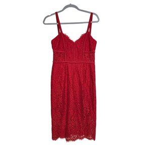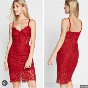Dress to impress at your next party or cocktail event with this striking sleeveless dress from Express. The rich red color and delicate lace eyelet detailing exude sophistication, making it a perfect choice for holiday gatherings or any special occasion. Its knee-length cut and A-line, pencil dress style offer a flattering silhouette for a size 2. Crafted from high-quality lace fabric, this dress combines both comfort and designer appeal. Its solid pattern and timeless theme make it a versatile addition to your wardrobe. Whether you're the guest of honor or attending as a guest, this dress is sure to turn heads and make a statement.