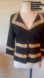Beautiful Designer Elaris black with gold trim notched collar cardigan sweater with 2 pockets decorative trim, Size L. Vintage in Perfect condition - Pit to pit is 17” laying flat, arm length is 18” and shoulder to hem is 22 inches. Simply stunning! Free shipping. Questions? Leave a comment below!