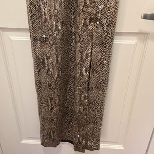 Designer evening gown in brown & white snake print with scattered clear sequins. Features halter neckline, high front slit, back zipper & full lining.