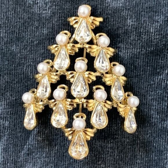 Designer Signed Avon with BW printed. Christmas Tree Brooch Pin featuring interlocking Angels set with Faux Pearl and Teardrop Crystals in Gold tone mounting; approx. 2 1/8 " high. Place an Angel on your shoulder this Christmas and bring smiles to all you meet! A Must Have for that Special Someone