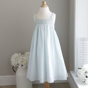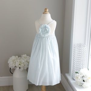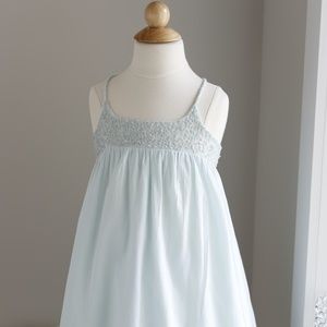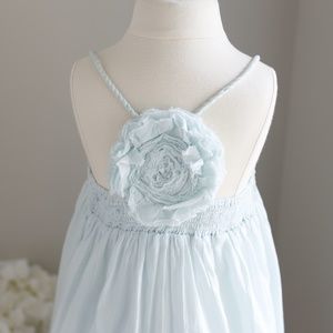 This Aqua blue/mint dress for girls by La Piccola Danza is amazing. La Piccola Danza dresses are for everyday glamour and special occasion fashion for children. Couture for girls! This particular dress was published in Vogue Bambini magazine. The lovely design of the dress consists of an aqua blue super soft cotton lawn. The bodice is adorned with hand-sewn matching sequins. The halter style straps are made of cotton and braided for a unique look. The icing on the cake of this dress is the cotton puff fabric flower at the upper back where the rope straps join. Beneath the fancy fabric flower is smocking across the back for comfort. The dress is a size 8, but will accommodate a size 6 (see measurements below for fit). Wear as an 8 for a shorter chic look or wear as a size 6 for a longer sundress length. Absolutely perfect dress for a beach portrait! Wear for summer vacation dinners or to church or any party. Dress-up or down with accessories. Very versatile Dress! Bought at Neiman Marcus Worn once for a portrait- Perfect condition-great price!!
