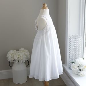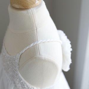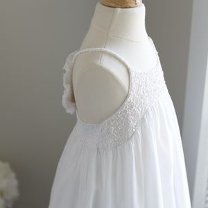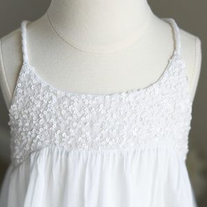 This SEQUINED white dress for girls by La Piccola Danza is amazing. La Piccola Danza dresses are for everyday glamour and special occasion fashion for children. Couture for girls! This particular dress was published in Vogue Bambini magazine. The lovely design of the dress consists of a white super soft cotton lawn. The bodice is adorned with hand-sewn white sequins. The halter style straps are made of cotton and braided for a unique look. The icing on the cake of this dress is the cotton puff fabric flower at the upper back where the rope straps join. Beneath the fancy fabric flower is smocking across the back for comfort. The dress is a size 7, but will accommodate a size 5 (see measurements below for fit). Wear as a 7 for a shorter chic look or wear as a size 5 for a longer sundress length. Absolutely perfect dress for a beach portrait! Wear for summer vacation dinners or to church or any party. Great for a summer Flower Girl! Dress-up or down with accessories. Very versatile Dress! Bought at Neiman Marcus Worn once for a portrait- Perfect condition-great price!!