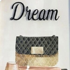 - home decor print with silkscreen "Dream" words & designer images of perfume bottles, pearls, wine glass & books in pink, cream, blue & white colors