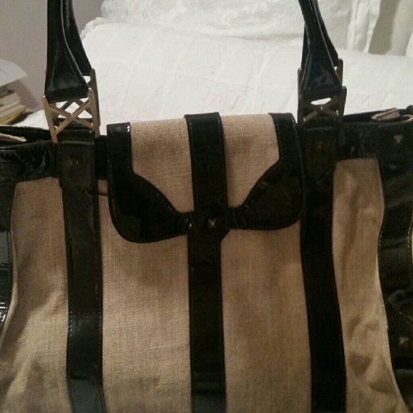 Beautiful Tan Canvas with Black patten leather with polished Brass adornments