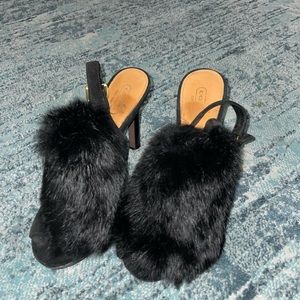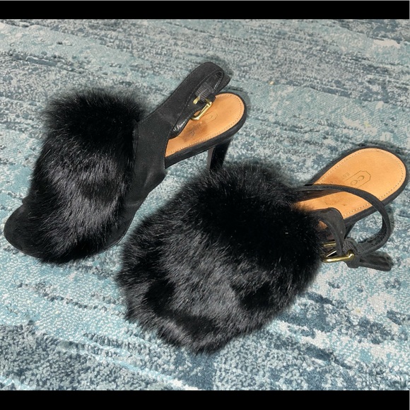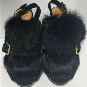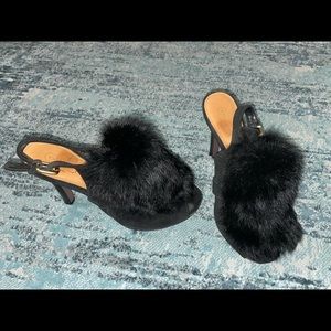 Coach Black Rabbit fur peep heels, sling back, open toe. Gold belt can be worn over or under fur