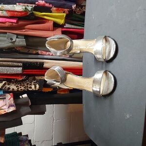 American Rag womes leather ,silver metallic toe out heel with velcro ankle straps, size 9.5