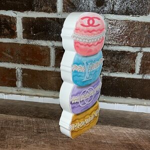 Chic designer inspired macaron stack wood decor in pastel pink, blue, purple, and gold colors. A few small nicks as shown in pics and video. Good condition overall.