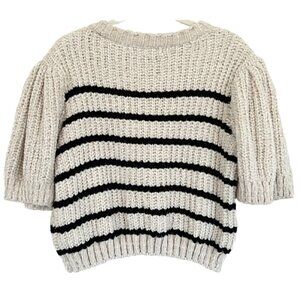 Soft sailor-stripe knit with a cropped silhouette and puff sleeves that create a flattering, elevated shape. The ribbed trim and neutral cream-and-black palette make this a timeless capsule piece that pairs effortlessly with denim, skirts, or trousers.