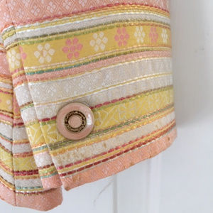 Made by Kelly Graham New York, this adorable pastel suit has a slightly flared jacket with a wide collar attractive to the neckline and 3/4 length sleeves. The matching pencil skirt has an approximately 5 inch slit in the back. The adorable peach buttons are on the front and sleeves. Lined and dry clean only. Size 8.