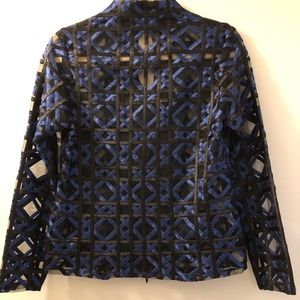Beautiful designer jacket that can be worn over a simple black dress or you can simply wear with jeans for a classy night out. The royal blue and black is the perfect combination color for this geometric designer jacket .Perfect for fall and winter .