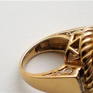 Gorgeous Designer Laura Ramsey solid 14K Yellow Gold Genuine Blue Chalcedony Genuine Diamond Cluster Filigree Cocktail Dinner Statement Ring about size 6.25-6.5 (marked "14K LR" and acid tested). Top of the ring is about 22mm in width, bottom is about 2.5mm in width. This unique ring weighs about 12.3 grams and is in great used pre-owned condition.